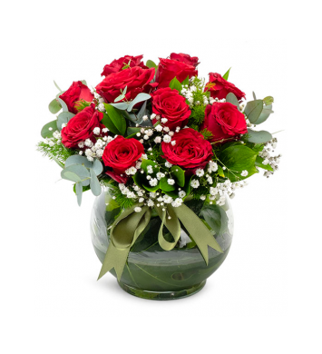 Cam fanusta 10 adet kırmızı gül ile hazırlanmıştır.