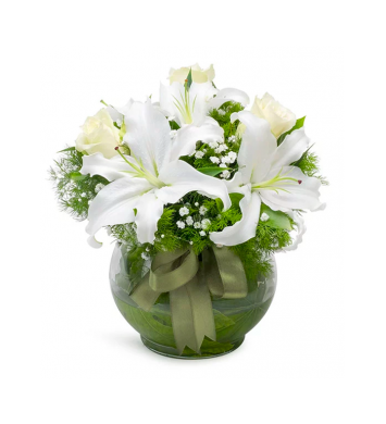 Beyaz Lilyumlar ve Beyaz Güller ile hazırlanmıştır.