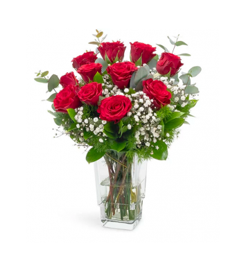 Dekoratif vazo içerinde 11 adet kırmızı gül ile hazırlanmıştır.