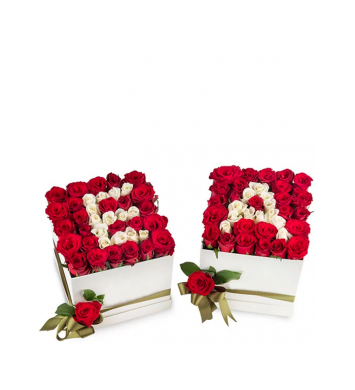 Beyaz kare kutu içerisinde kırmızı ve beyaz güllerden hazırlanmıştır.