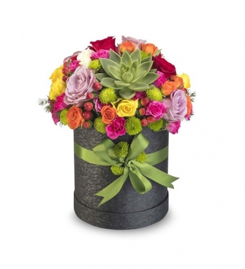 Siyah silindir kutu içerisinde 1 adet sukulent ve renkli mevsim çiçeklerinden hazırlanmıştır.