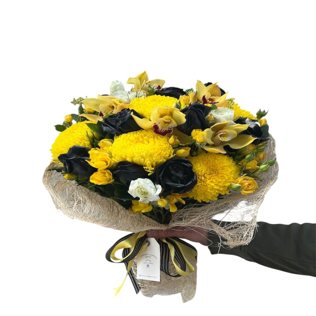 Yellow Anastasia Black Roses and Orchid Sarı Ansatasia Siyah Gül ve Orkide Buketi